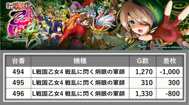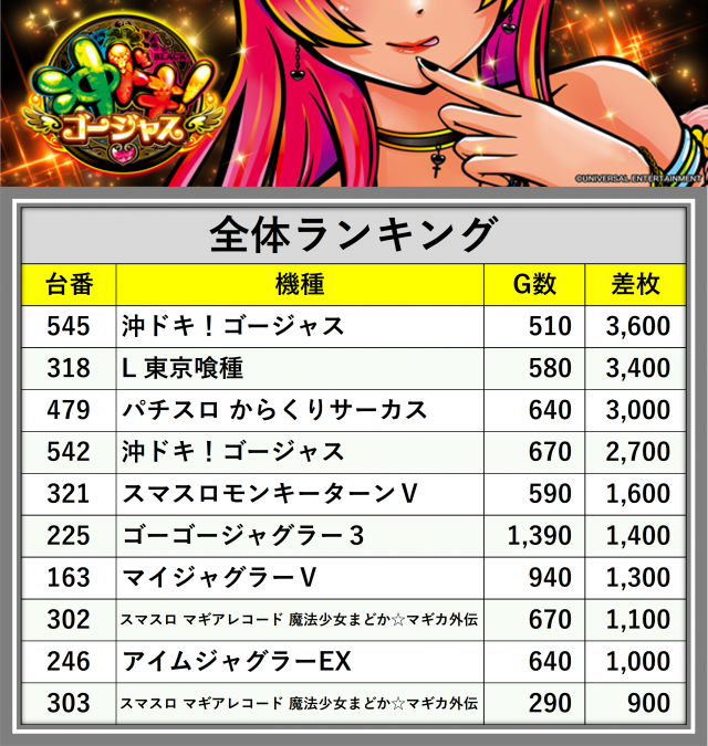 厳選された取材対象機種をはじめ、その他スロット全体から好記録が飛び出した!プレイヤーが楽しんだ1日を下記データにて振り返ってみて欲しい。