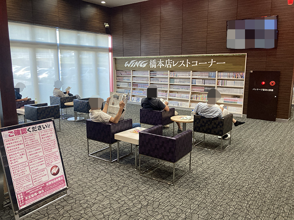 レストスペースには幅広いジャンルの漫画本が用意されており、取材時も満喫するプレイヤーが多かった。