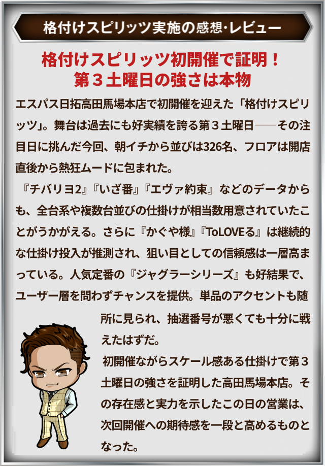 9月20日(土)エスパス日拓高田馬場本店ジアス上大岡にて、DMMぱちタウンの「格付けスピリッツ」を実施。