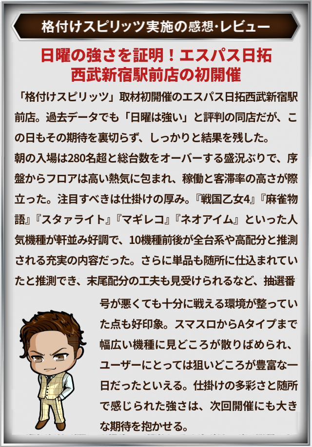 9月14日(日)エスパス日拓西武新宿駅前店にて、DMMぱちタウンの「格付けスピリッツ」を実施。