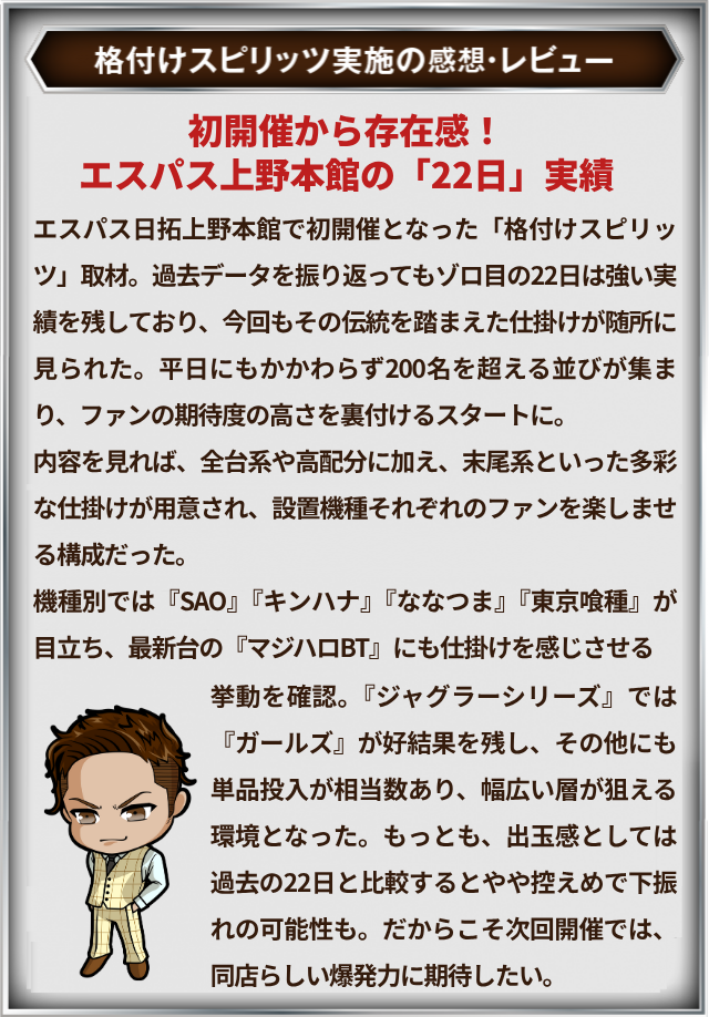 9月22日(月)エスパス日拓上野本館にて、DMMぱちタウンの「格付けスピリッツ」を実施。