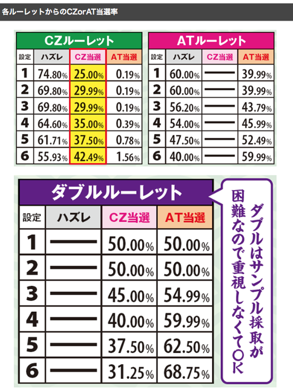 高設定はルーレットからCZやATに当選しやすいこともふまえたうえで、推測していきたい。