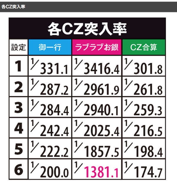 CZの当選率に設定差が存在している。高設定ほど、ラブラブお銀の突入率が高くなっていることも把握しておこう。