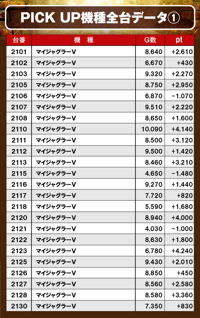 『マイジャグラーⅤ』は全台での結果が素晴らしく、設置台数24台中21台がプラスptで終了!さらに17台は4桁プラスptを記録している!回転数を見ても打ち込まれていた様子が窺え、活気と熱気に満ちた1日となったようだ。