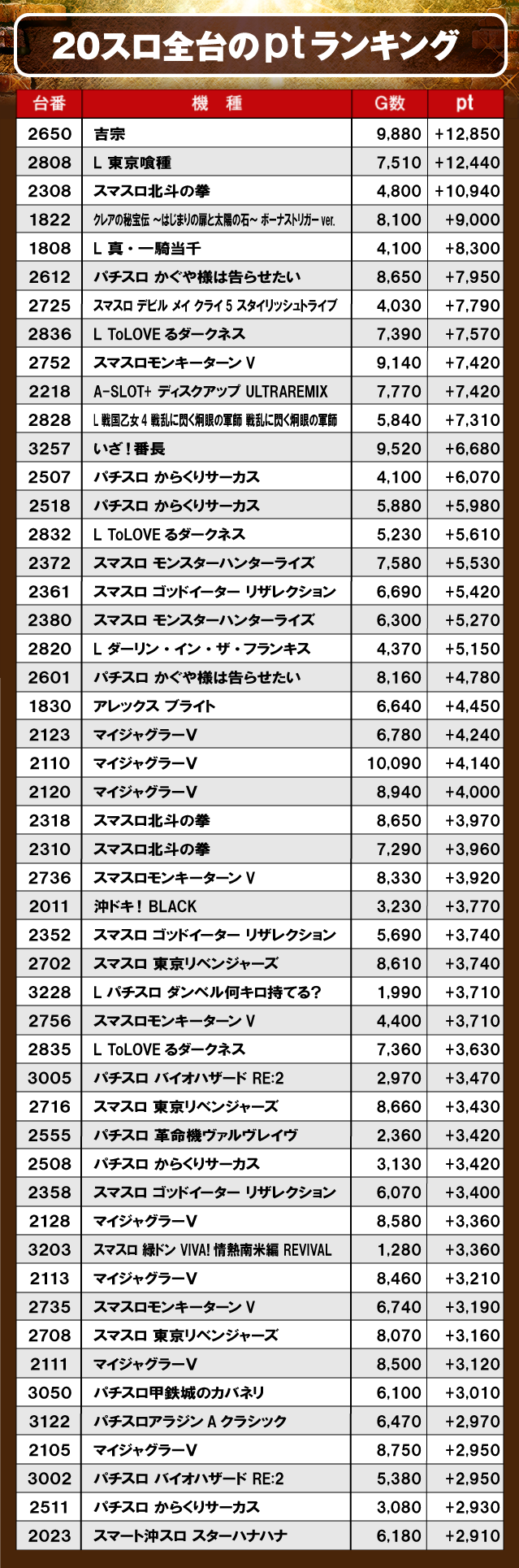 1日を通して大きな盛り上がりを見せ、閉店までその熱気が冷めることがなかった。その結果『吉宗』『L 東京喰種』『スマスロ北斗の拳』から万ptOVERが生まれ、ファンの期待に応える素晴らしい内容だった。このほかにも大台突破台が多数生まれており、各所でファンが笑顔を浮かべる光景が広がっていたぞ!