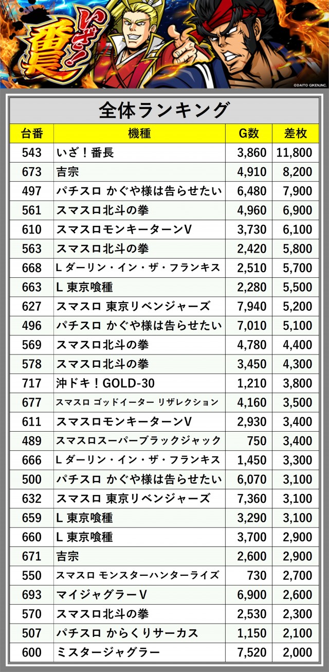 厳選された取材対象機種をはじめ、その他スロット全体から好記録が飛び出した!プレイヤーが楽しんだ1日を下記データにて振り返ってみて欲しい。