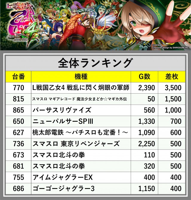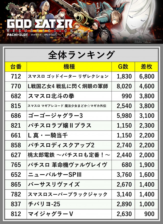厳選された取材対象機種をはじめ、その他スロット全体から好記録が飛び出した!プレイヤーが楽しんだ1日を下記データにて振り返ってみて欲しい。