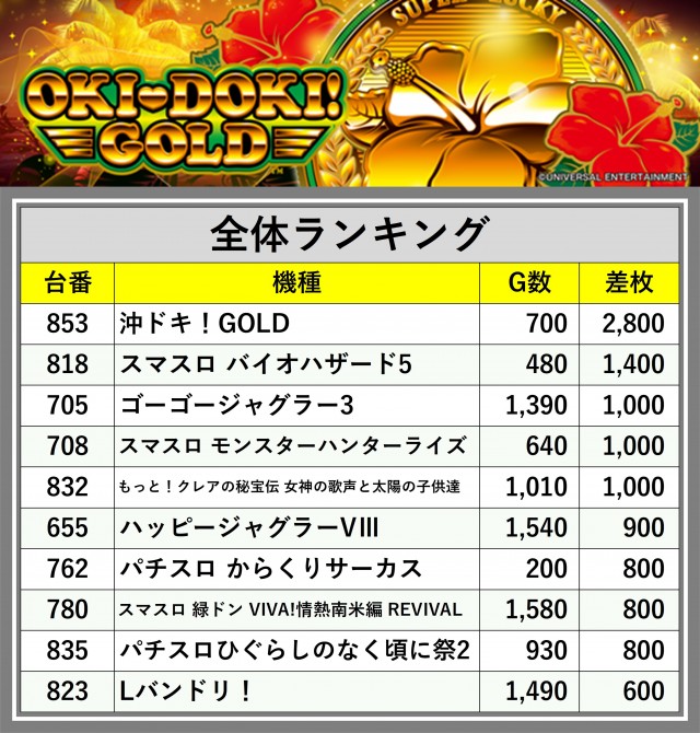 厳選された取材対象機種をはじめ、その他スロット全体から好記録が飛び出した!プレイヤーが楽しんだ1日を下記データにて振り返ってみて欲しい。