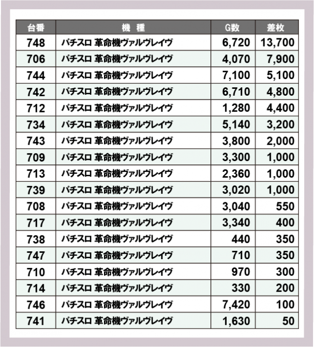 ※差枚数順に掲載しています