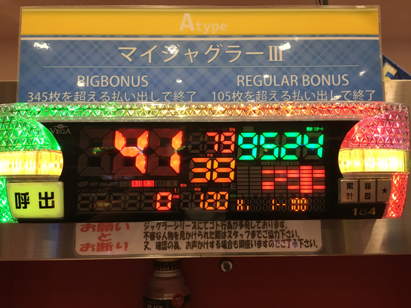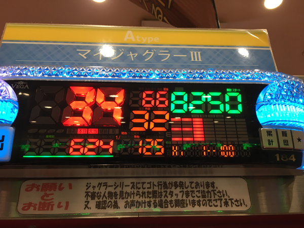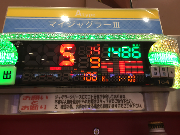 前半はボーナス回数こそ多くなってしまうも、REGにかたよったこともあり、大きなタイムロスはナシ。順調に「マイジャグラーⅢ」をブン回していった。