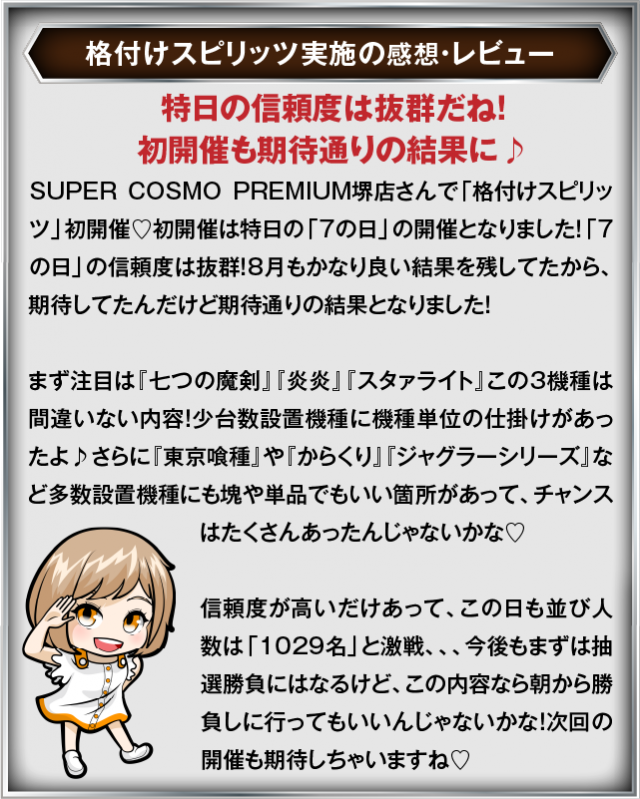 9月7日(日) SUPER COSMO PREMIUM堺店にて、DMMぱちタウンの「格付けスピリッツ」を実施。