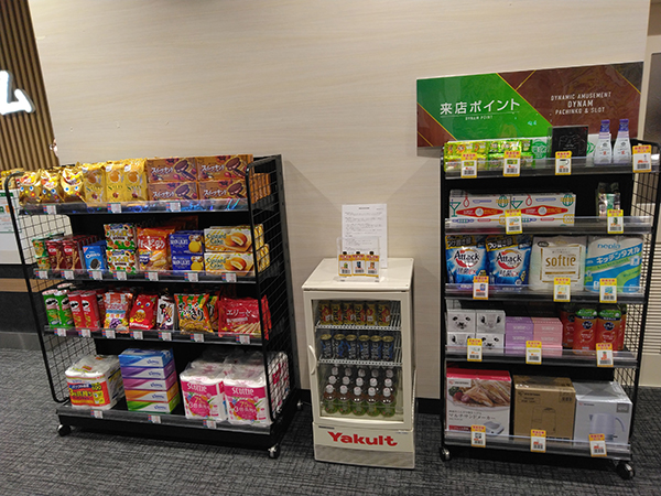 景品コーナーには日用品・お菓子・ドリンク類など多彩なアイテムが揃っており、プレイヤーたちの目を引いていた。
