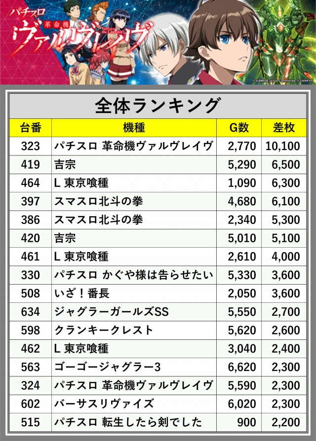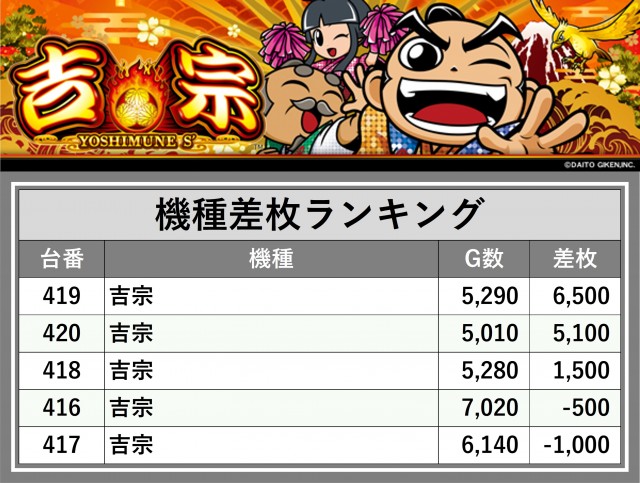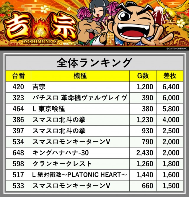 厳選された取材対象機種をはじめ、その他スロット全体から好記録が飛び出した!プレイヤーが楽しんだ1日を下記データにて振り返ってみて欲しい。