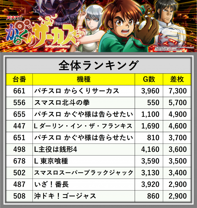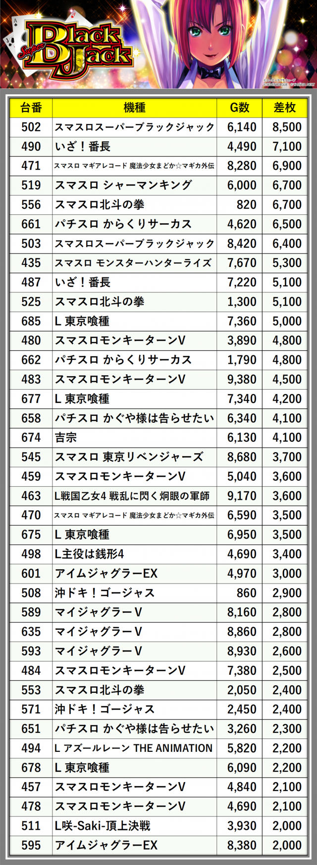 ※差枚数順に掲載しています