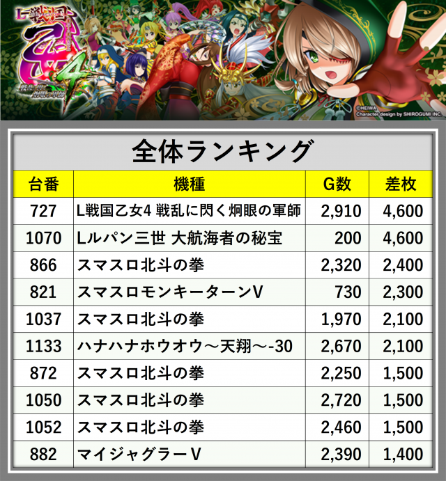 ※差枚数順に掲載しています