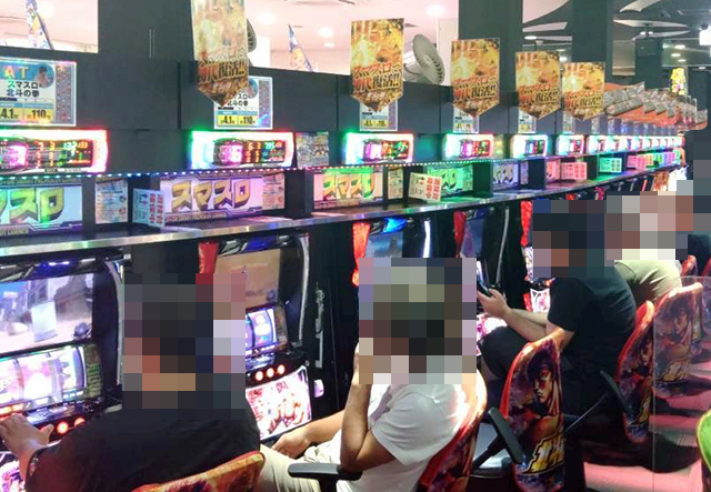 「スマスロ北斗の拳」で遊技をおこなっているプレイヤーが多く、シマ内はにぎやか。