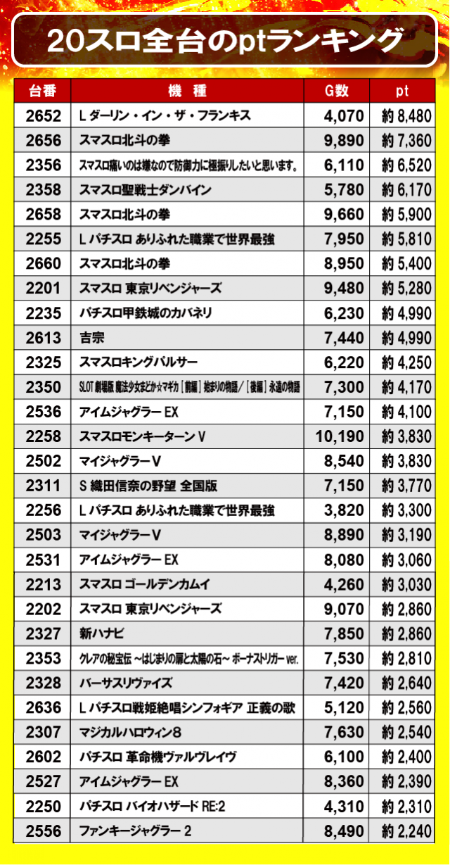 『L ダーリン・イン・ザ・フランキス』から大台突破の約8,480ptが発生!それに次いで、『スマスロ北斗の拳』から約7,360pt、『スマスロ痛いのは嫌なので防御力に極振りしたいと思います。』『スマスロ聖戦士ダンバイン』から約6,000ptOVERなど大きくまとまった出玉を獲得している台が続出!スマスロだけでなく、メダル機もしっかりとランキングに食い込んできており、幅広いユーザーにとって非常に楽しめる環境になっていたと言えるだろう。