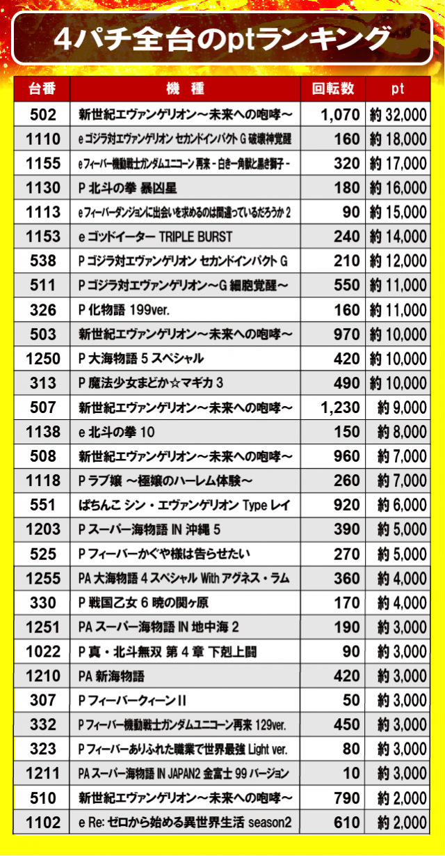 今回トップを飾った『新世紀エヴァンゲリオン〜未来への咆哮〜』は、約32,000ptをマークし大きな熱気を生み出していた。その他、幅広い機種が名を連ねており、店内のどこからでもチャンスが掴めるような素晴らしい状況だった!