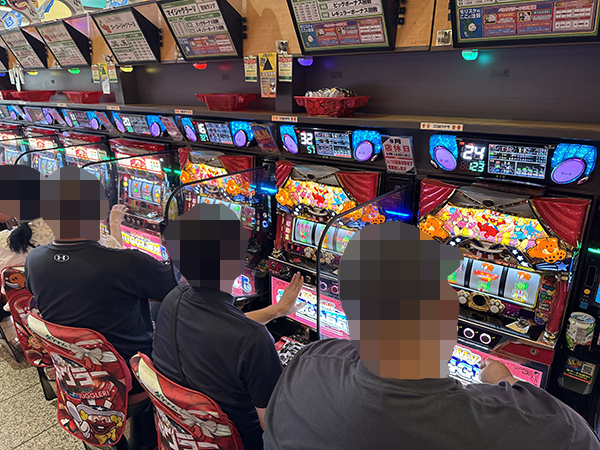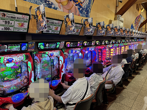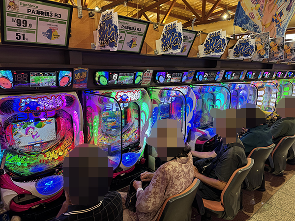 15時ごろの1円パチンコを見てみると「PA海物語3R3」や「PA大海物語5 Withアグネス・ラム」などの甘海シリーズが活況。プレイヤーの満足そうな表情から、充実した時間を過ごしていたことがうかがえる。