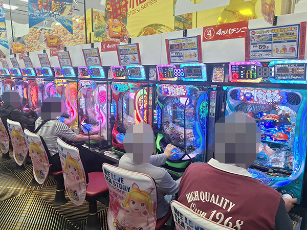 15時ごろの4円パチンコを見てみると「Pスーパー海物語 IN 沖縄5」や「PAスーパー海物語IN地中海2」などの海物語シリーズが高稼働。プレイヤーの嬉しそうな様子を多数確認している。