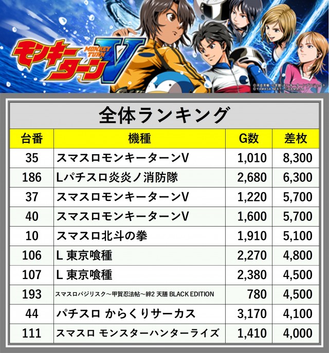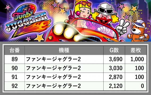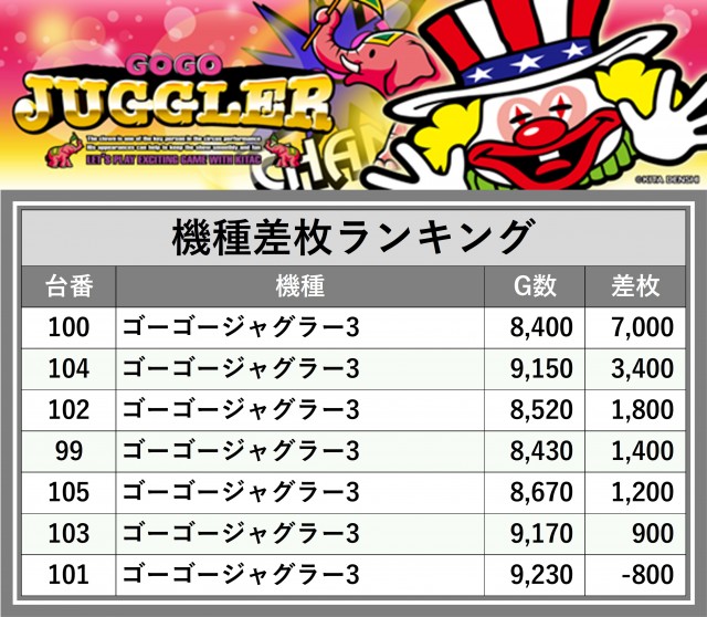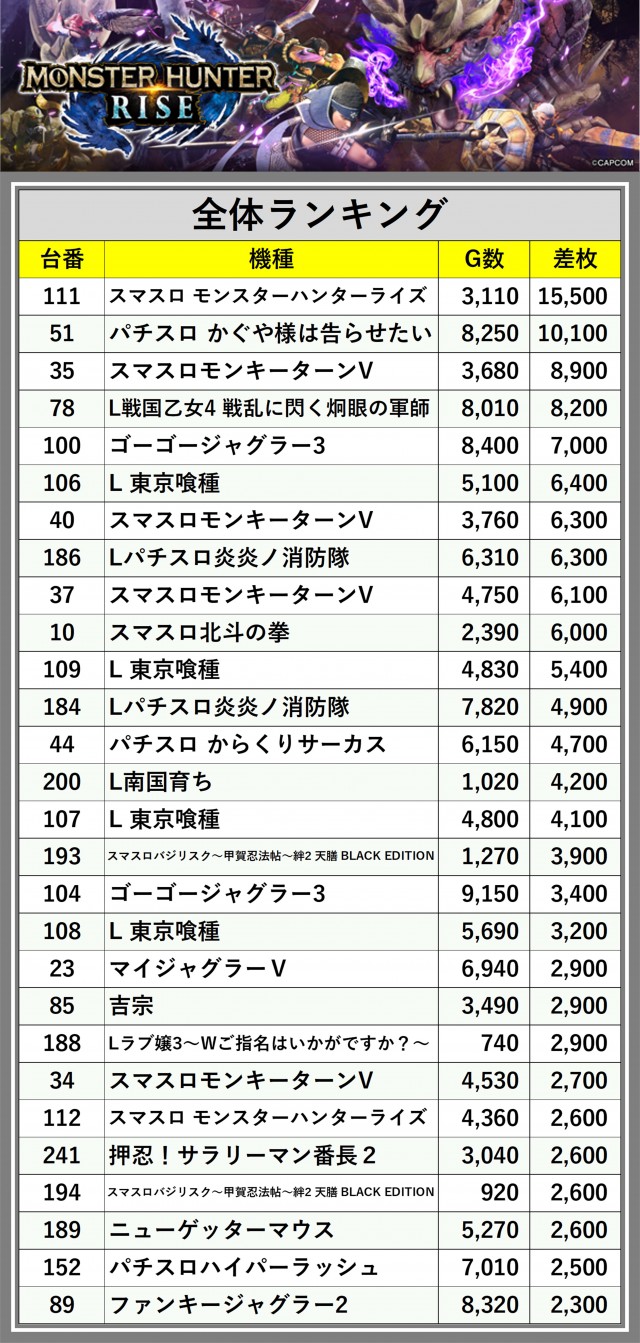 厳選された取材対象機種をはじめ、その他スロット全体から好記録が飛び出した!プレイヤーが楽しんだ1日を下記データにて振り返ってみて欲しい。