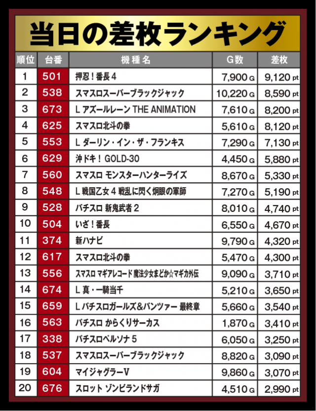 この日のSAPグループはひと味違う。DMMぱちタウンは、「SAP野田」の特別なひとときを一斉取材した。特に華々しい活躍を残した機種たちをピックアップして紹介しよう。まずは差枚ランキングの発表だ!