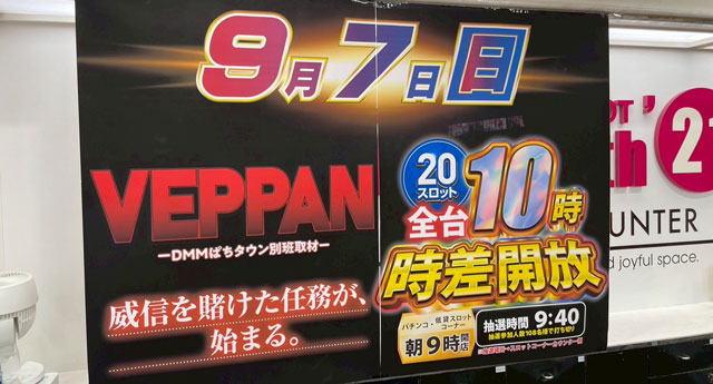 DMMぱちタウン取材班〝別班〟が威信を賭けて執り行う「VEPPAN」が、9月7日に「パーラーマンモス’21月寒店」にて実施された。朝から27人のファンが期待を胸に集結し、開店と同時にスロットコーナーは一気に大賑わい! プレイヤーたちの熱心な遊技が店内の盛り上がりを力強く牽引していたのが印象的だ。以下より詳細データとともに当日の活気をお届けするので、ぜひ最後まで目を通してほしい!