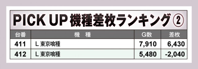 当日特に注目を集めたのが「スマスロ北斗の拳」と「L 東京喰種」の2機種だ。前者からは+3,300枚という申し分のない記録が生まれ、コーナー全体を活気づけていた。後者にも高記録台が出現しており、終日高稼働をキープ。両機種ともに、多くのファンが手応えを感じながら遊技を楽しんでいたことは間違いない。