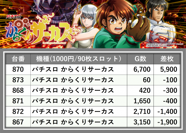 厳選された取材対象機種をはじめ、その他スロット全体から好記録が飛び出した!プレイヤーが楽しんだ1日を下記データにて振り返ってみて欲しい。