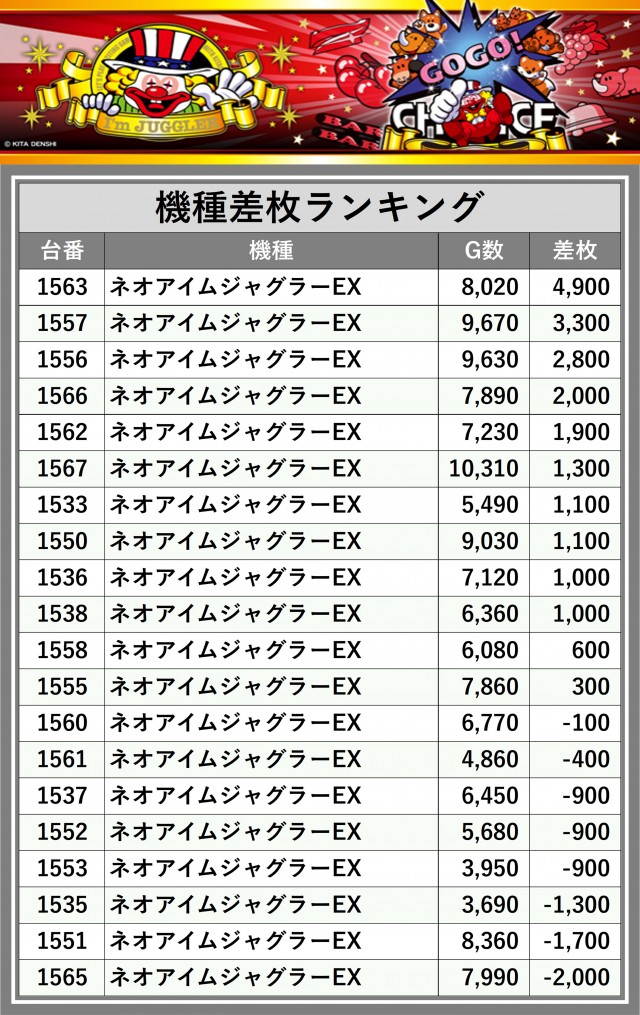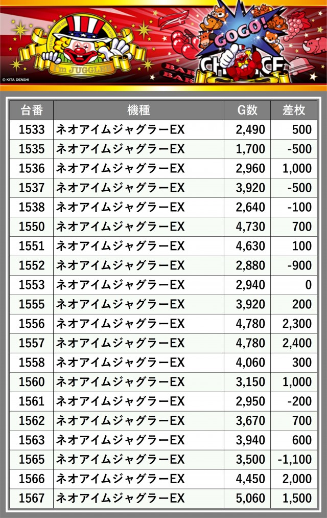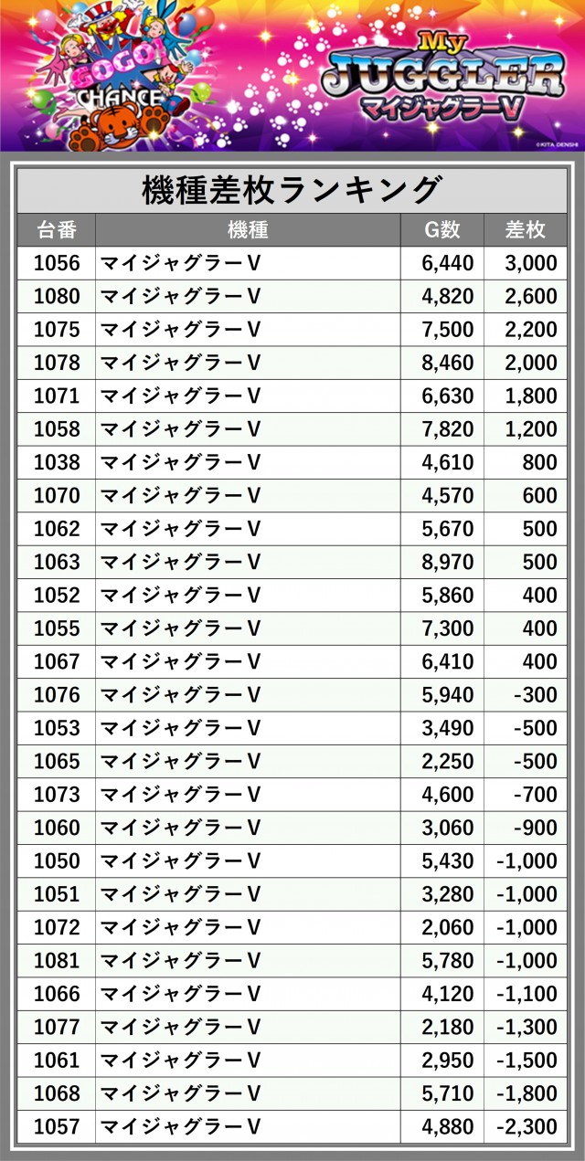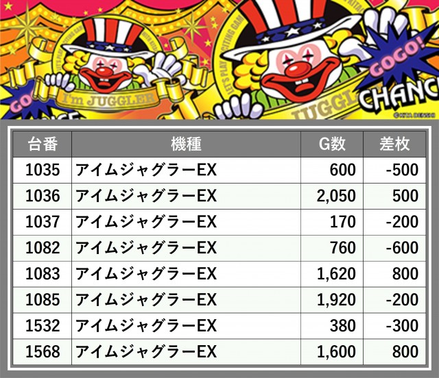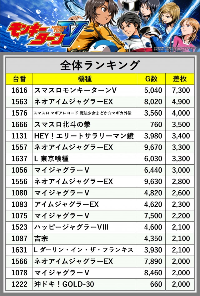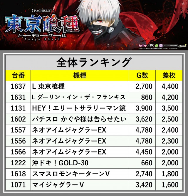 厳選された取材対象機種をはじめ、その他スロット全体から好記録が飛び出した!プレイヤーが楽しんだ1日を下記データにて振り返ってみて欲しい。
