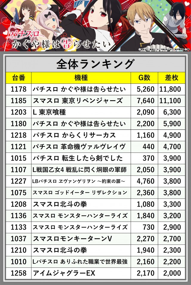 厳選された取材対象機種をはじめ、その他スロット全体から好記録が飛び出した!プレイヤーが楽しんだ1日を下記データにて振り返ってみて欲しい。