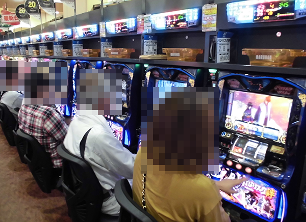 夕方頃の20円パチスロでは、「バジリスク~甲賀忍法帖~絆」やジャグラーシリーズが盛況。機種の魅力を堪能しているようなプレイヤーが目立ち、楽しげな雰囲気も感じられた。
