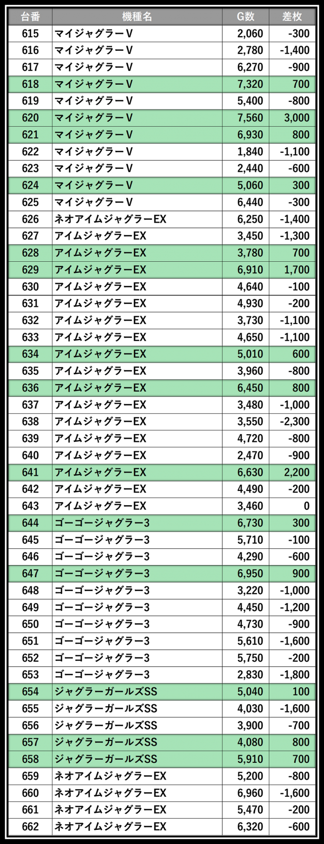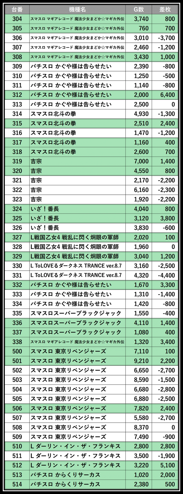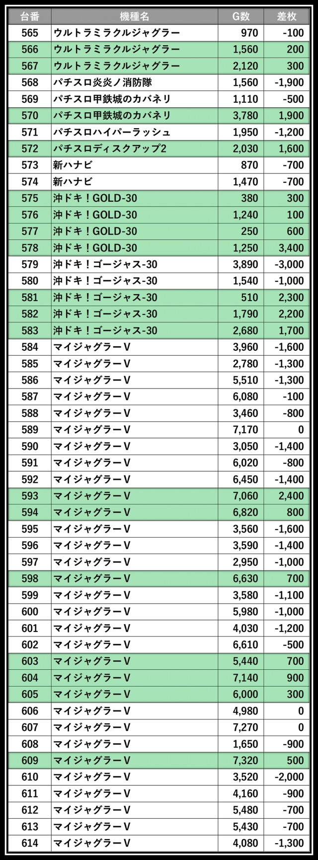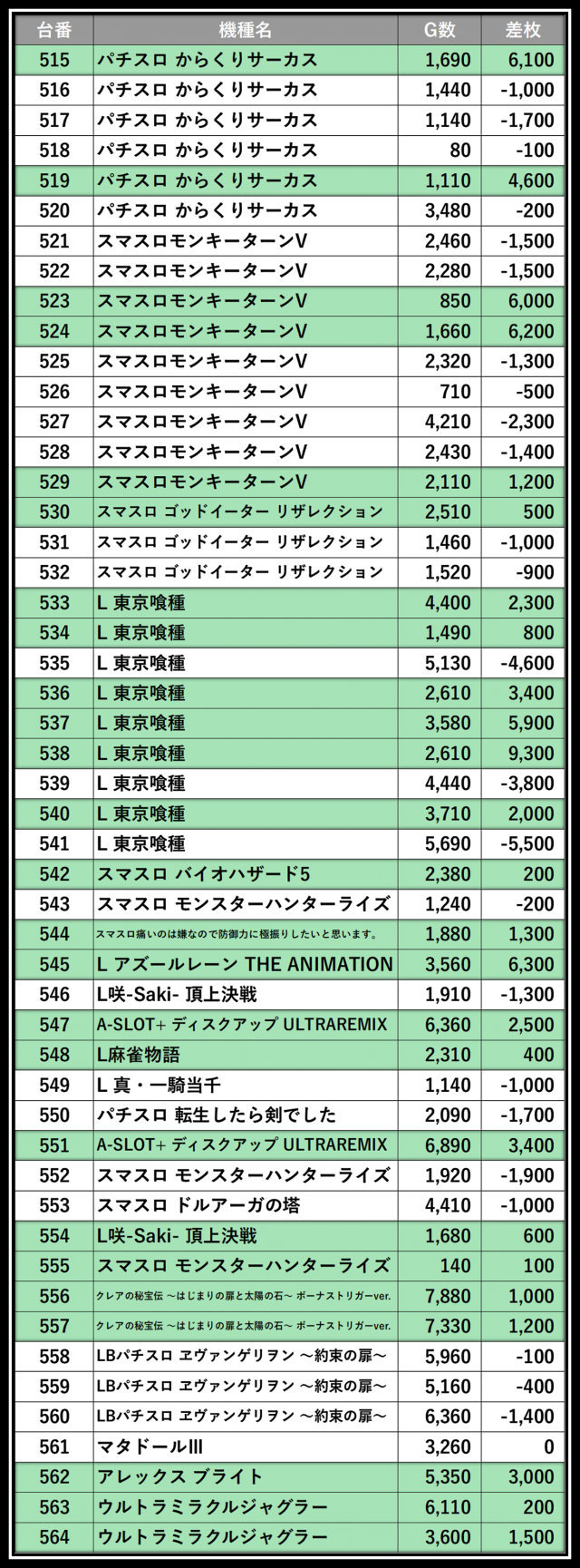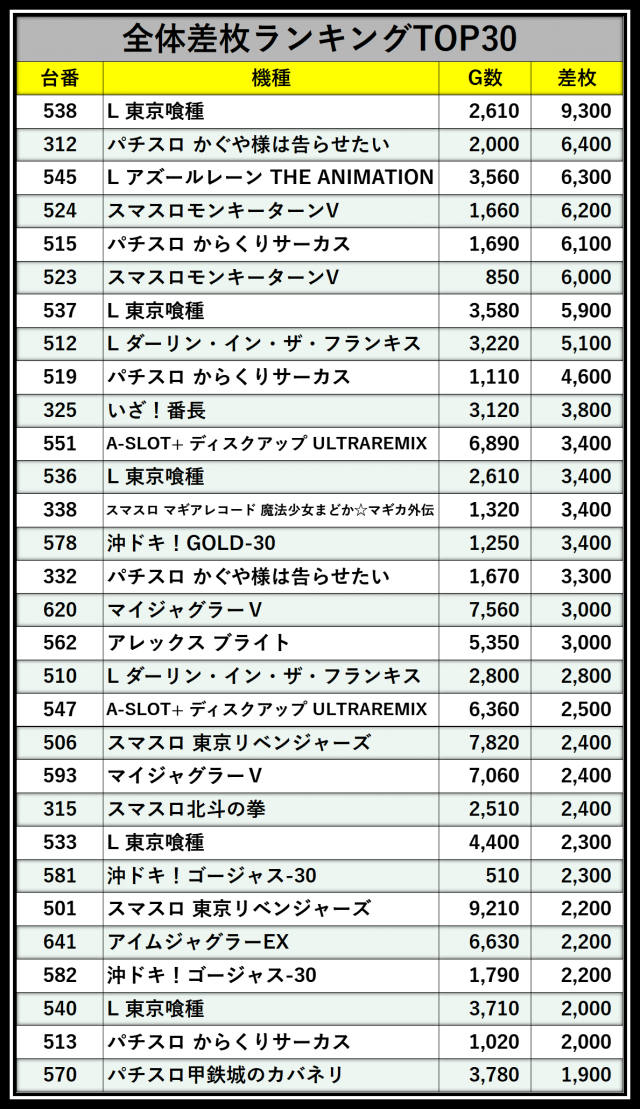 ※差枚数順に掲載しています