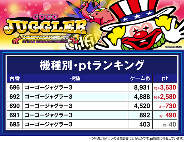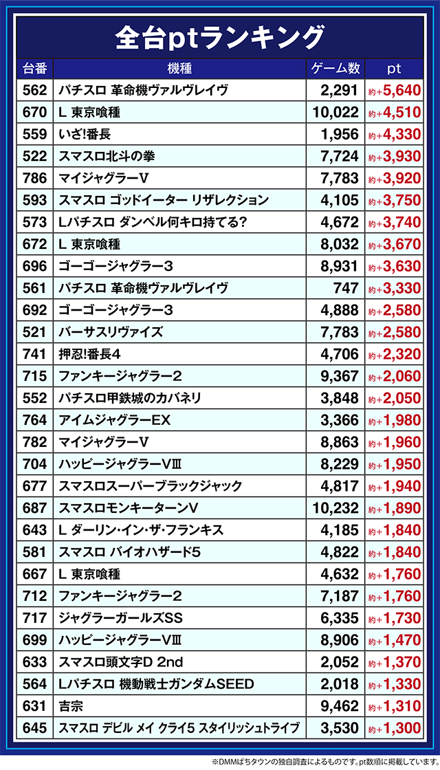 約+3,600ptを超えた672番台など、機種全体で5台が約+1,000pt以上となった。