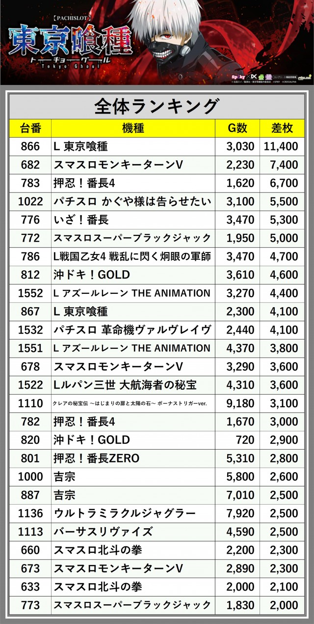 ※差枚数順に掲載しています
