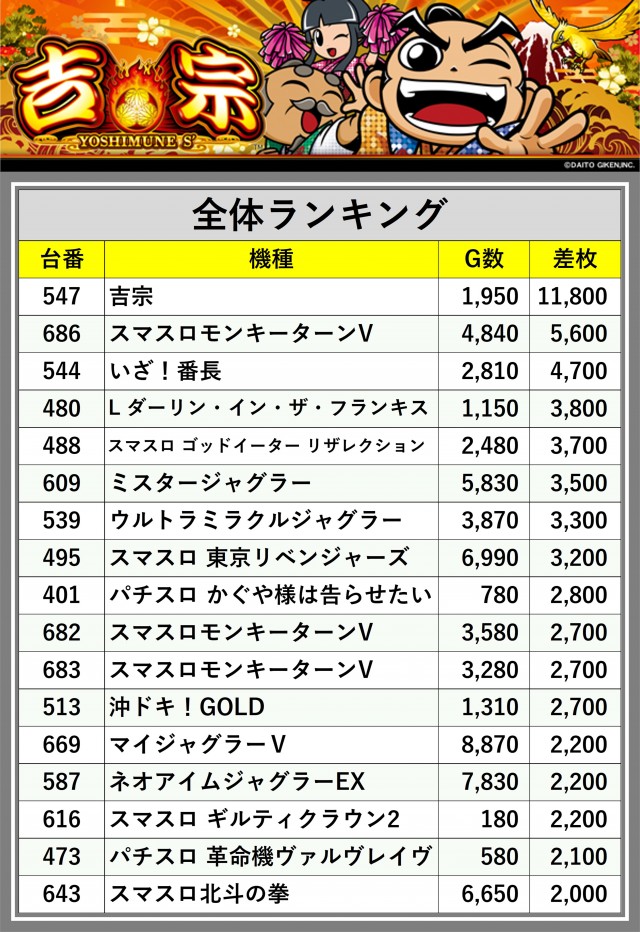 厳選された取材対象機種をはじめ、その他スロット全体から好記録が飛び出した!プレイヤーが楽しんだ1日を下記データにて振り返ってみて欲しい。