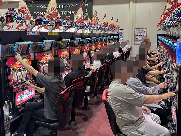 1000円/184枚パチスロの稼働も高い。嬉しそうにレバーを叩くプレイヤーの姿を複数目撃している。