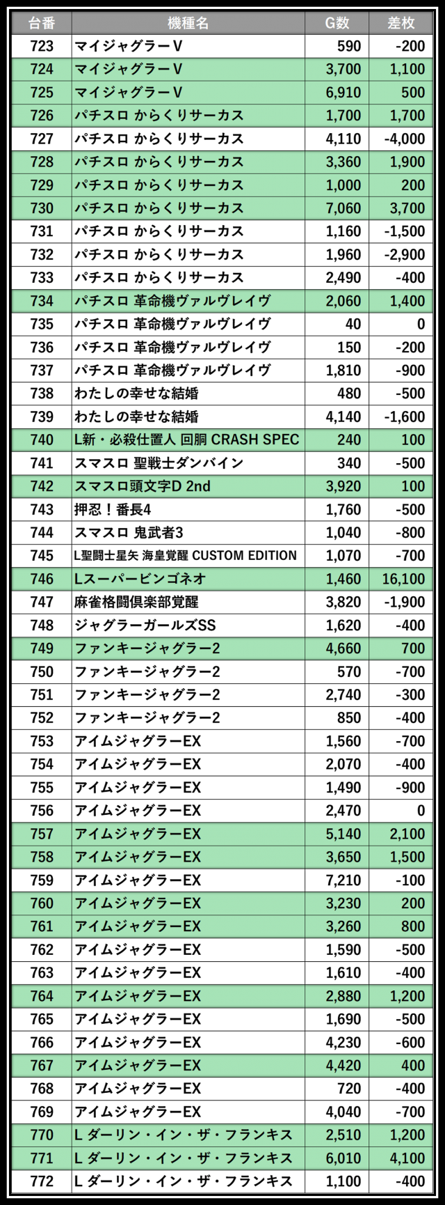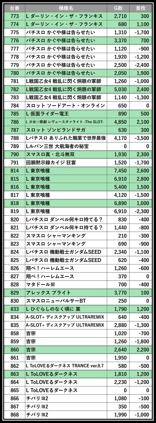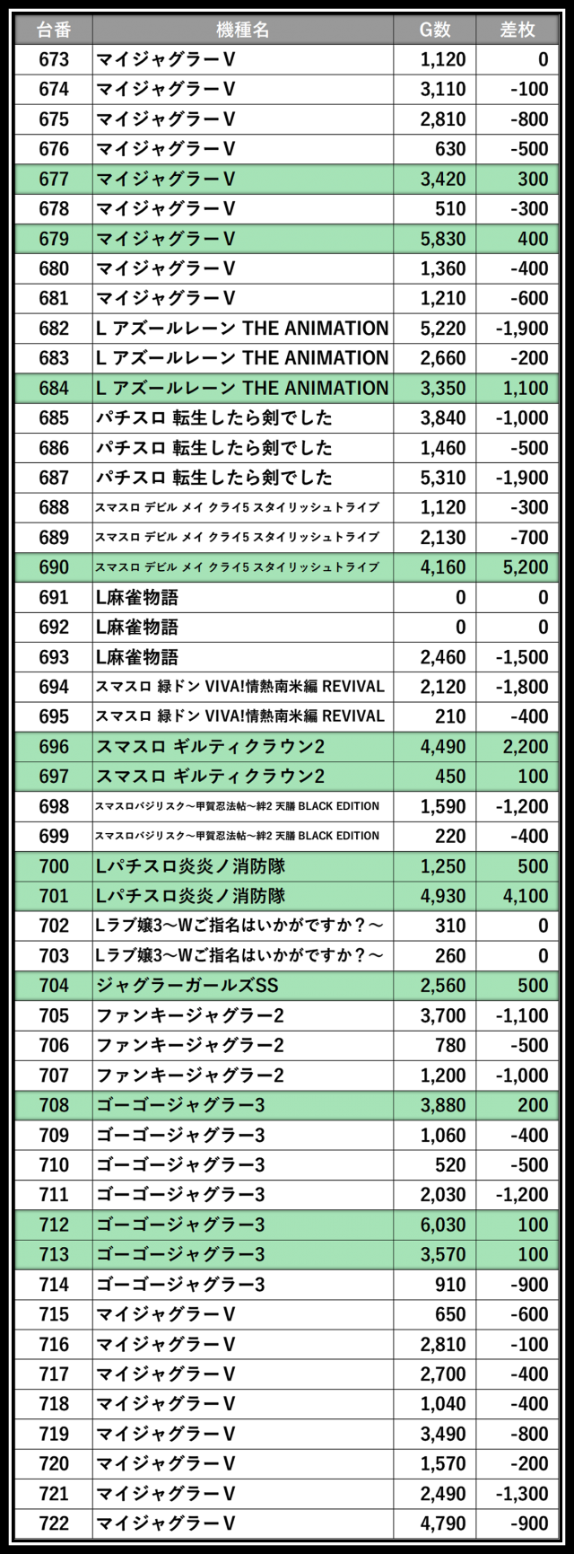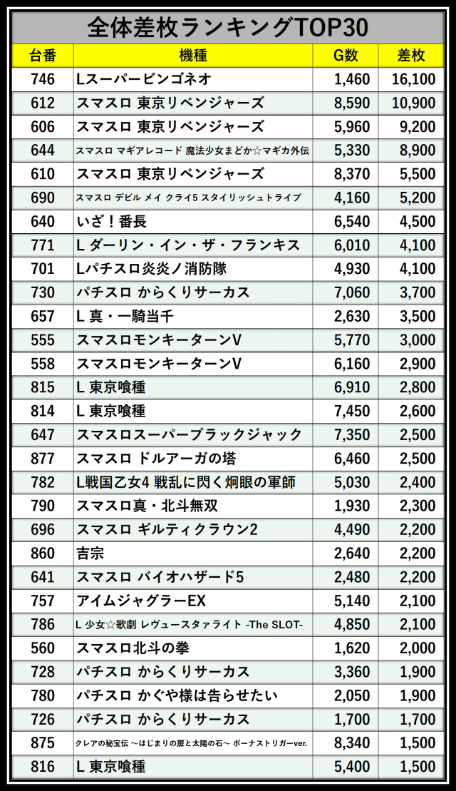 ※差枚数順に掲載しています