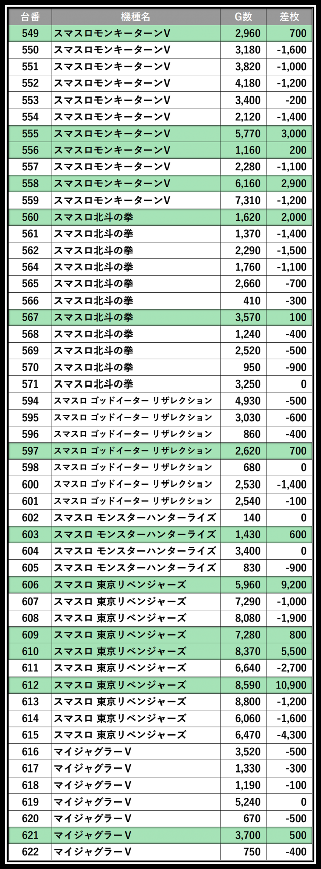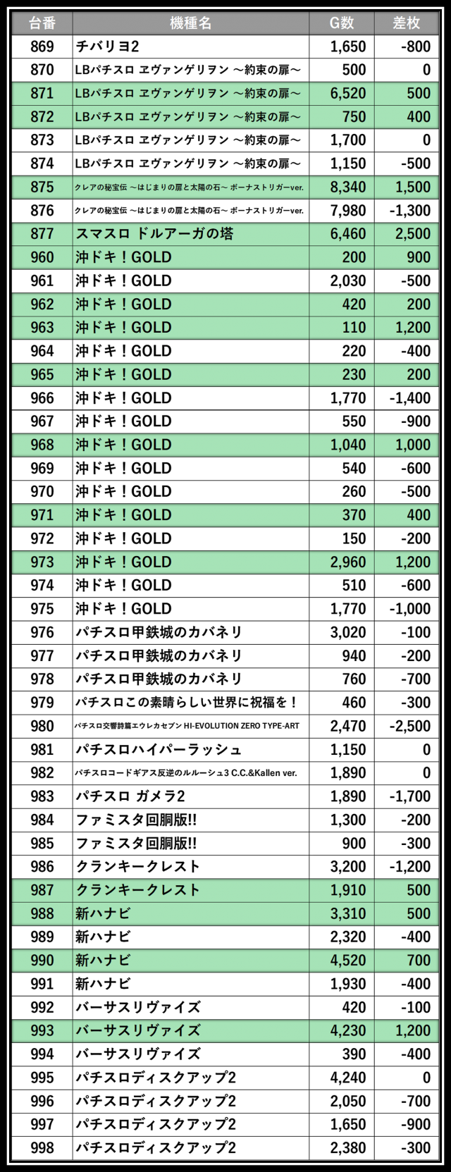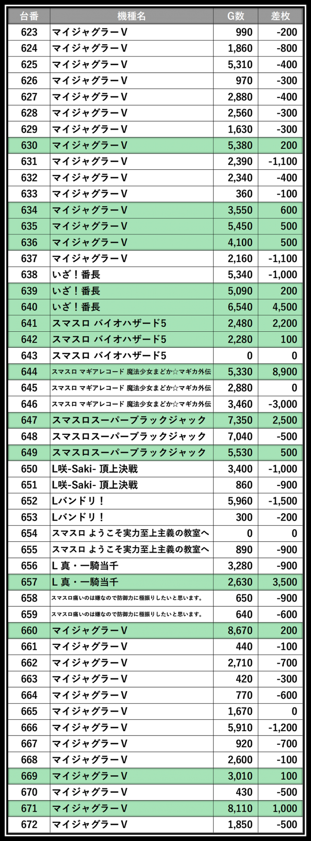 ※差枚数順に掲載しています