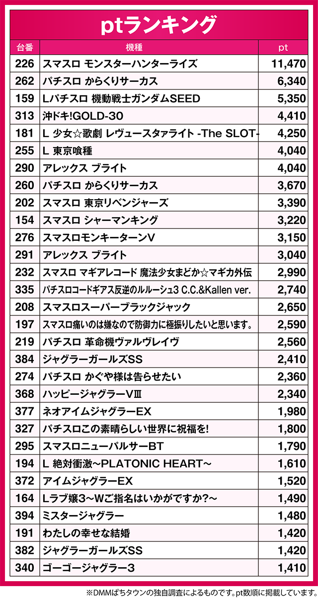 「パチスロ からくりサーカス」の262番台は約+6,300ptを超え、「Lパチスロ 機動戦士ガンダムSEED」の159番台も約+5,300pt以上となりました★