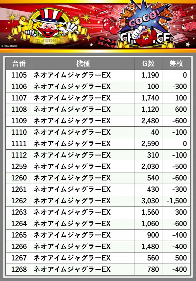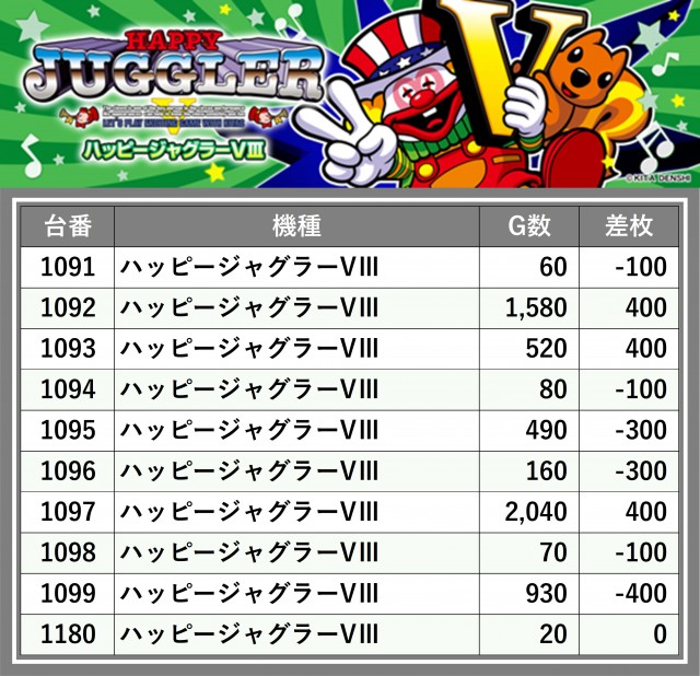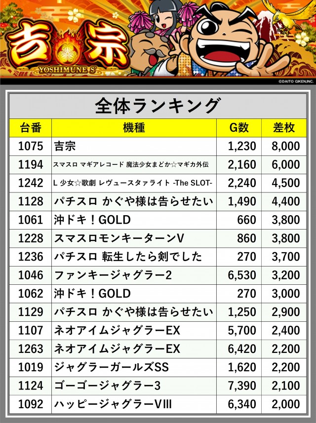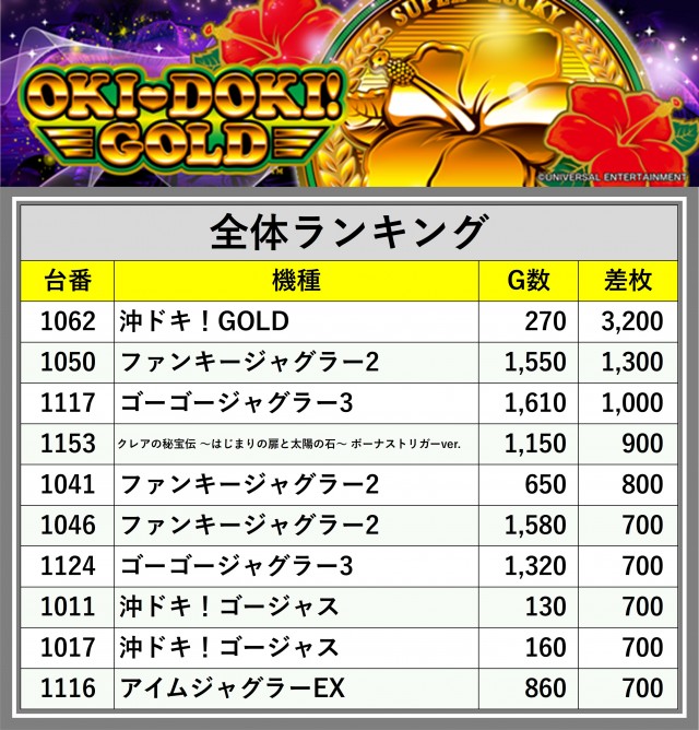厳選された取材対象機種をはじめ、その他スロット全体から好記録が飛び出した!プレイヤーが楽しんだ1日を下記データにて振り返ってみて欲しい。