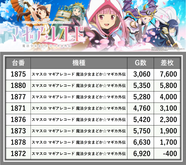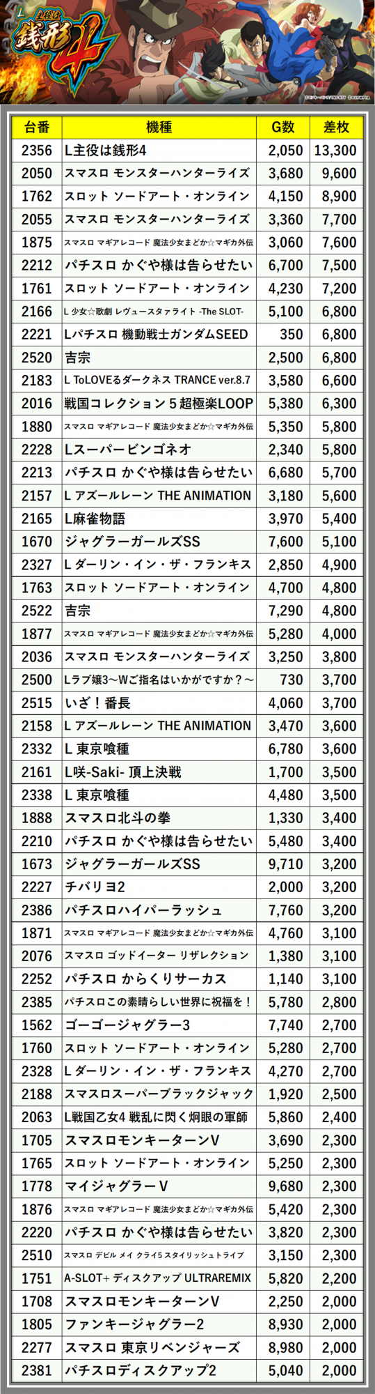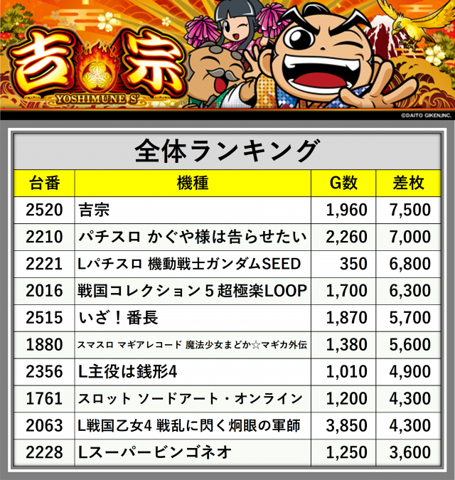 厳選された取材対象機種をはじめ、その他スロット全体から好記録が飛び出した!プレイヤーが楽しんだ1日を下記データにて振り返ってみて欲しい。
