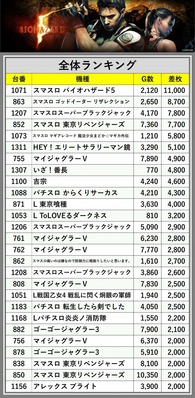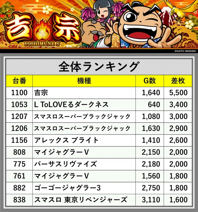 厳選された取材対象機種をはじめ、その他スロット全体から好記録が飛び出した!プレイヤーが楽しんだ1日を下記データにて振り返ってみて欲しい。
