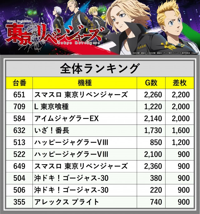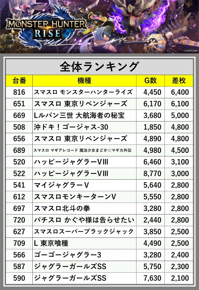 厳選された取材対象機種をはじめ、その他スロット全体から好記録が飛び出した!プレイヤーが楽しんだ1日を下記データにて振り返ってみて欲しい。