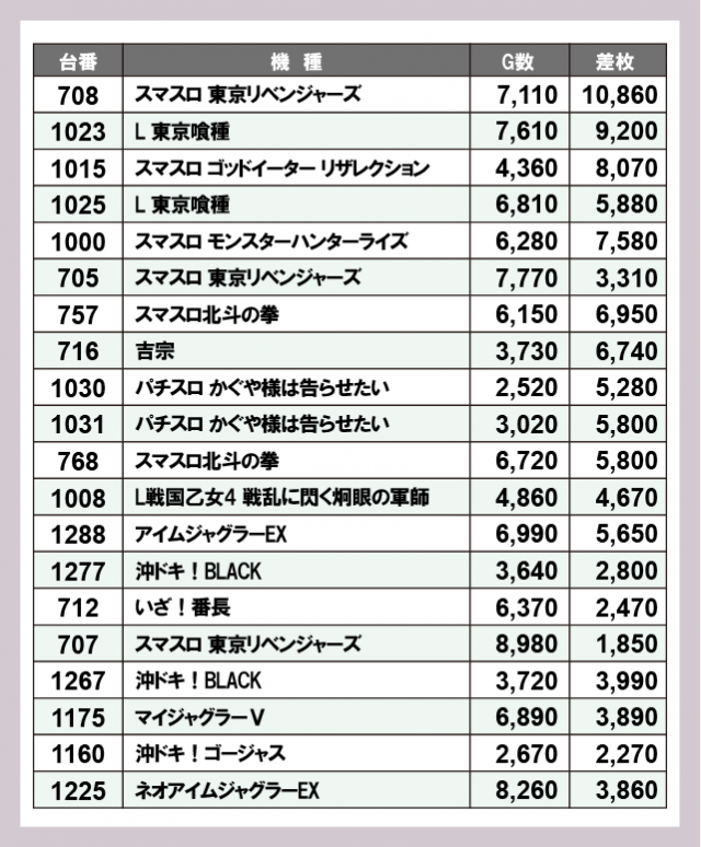 ※差枚数順に掲載しています