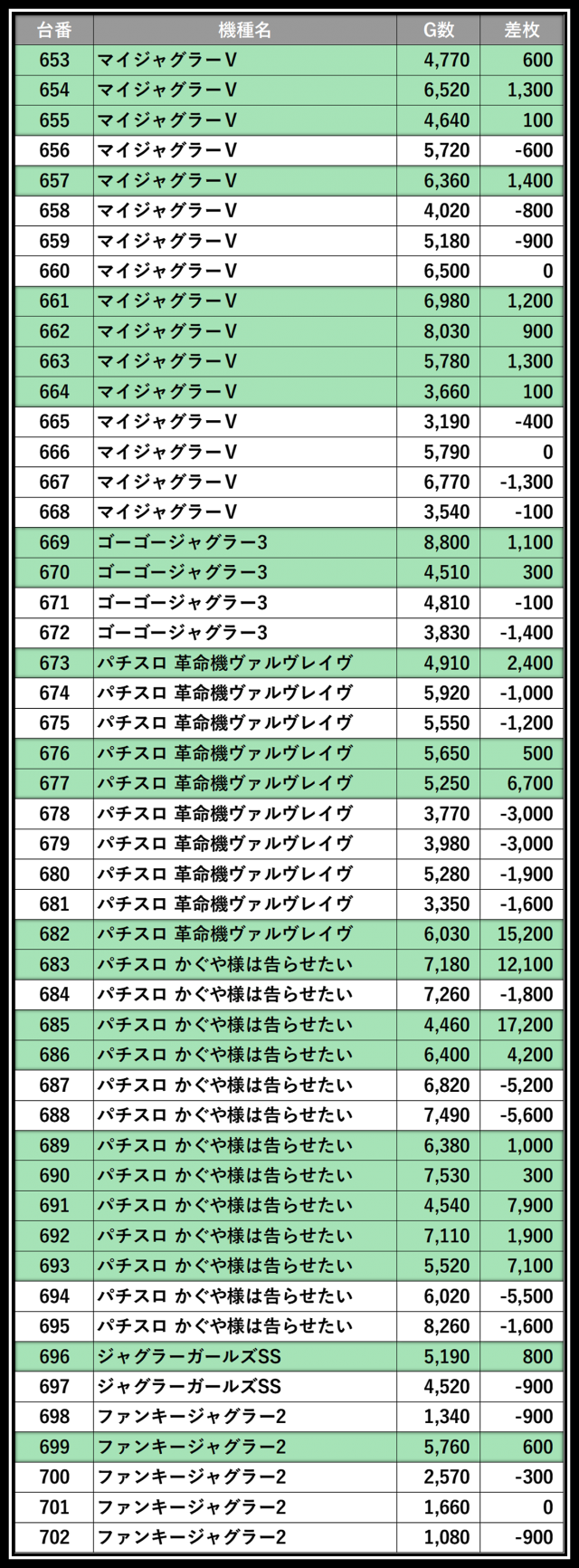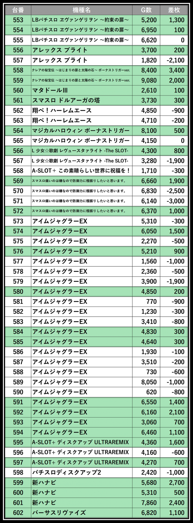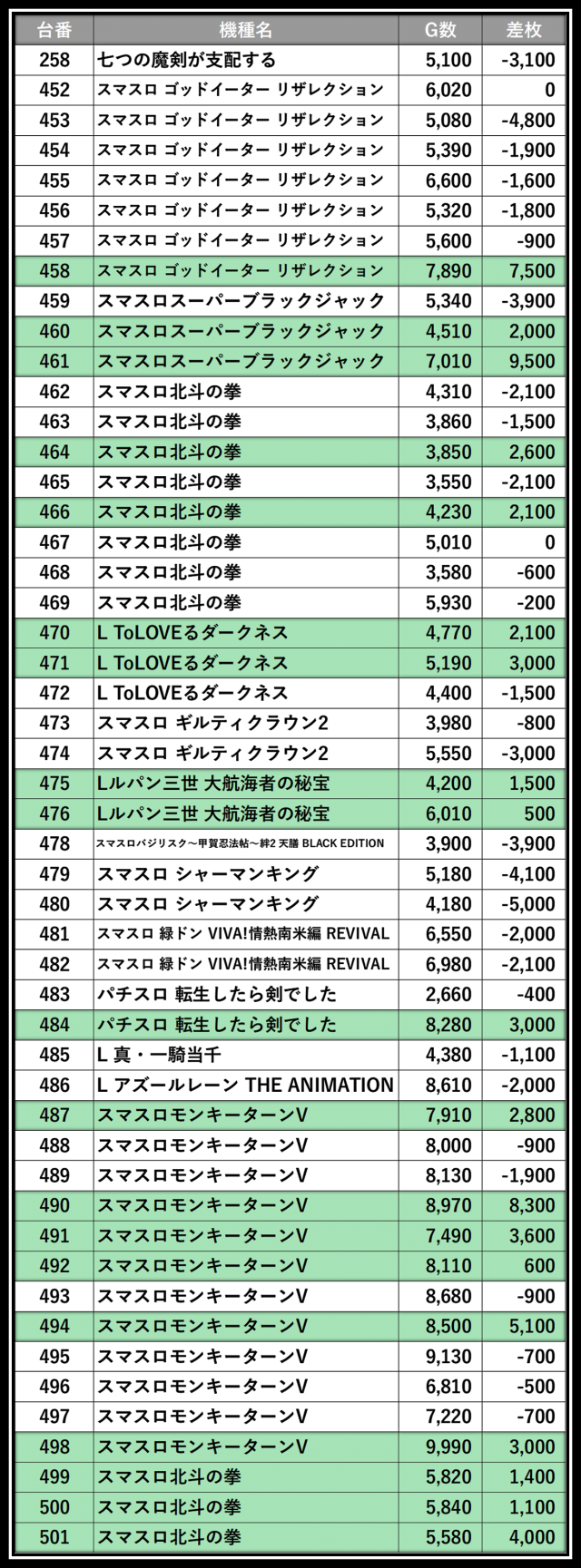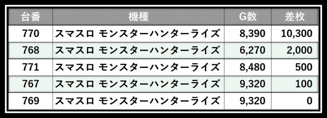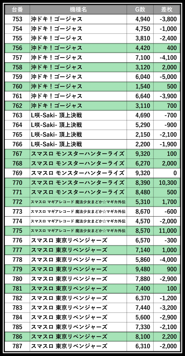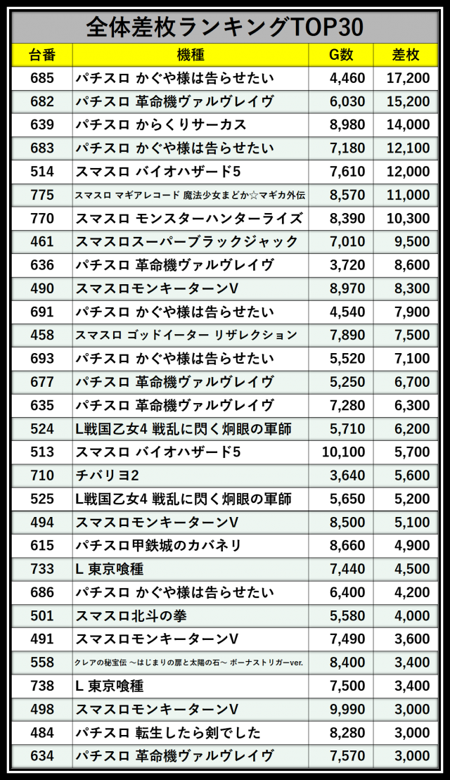 ※差枚数順に掲載しています