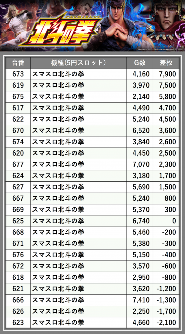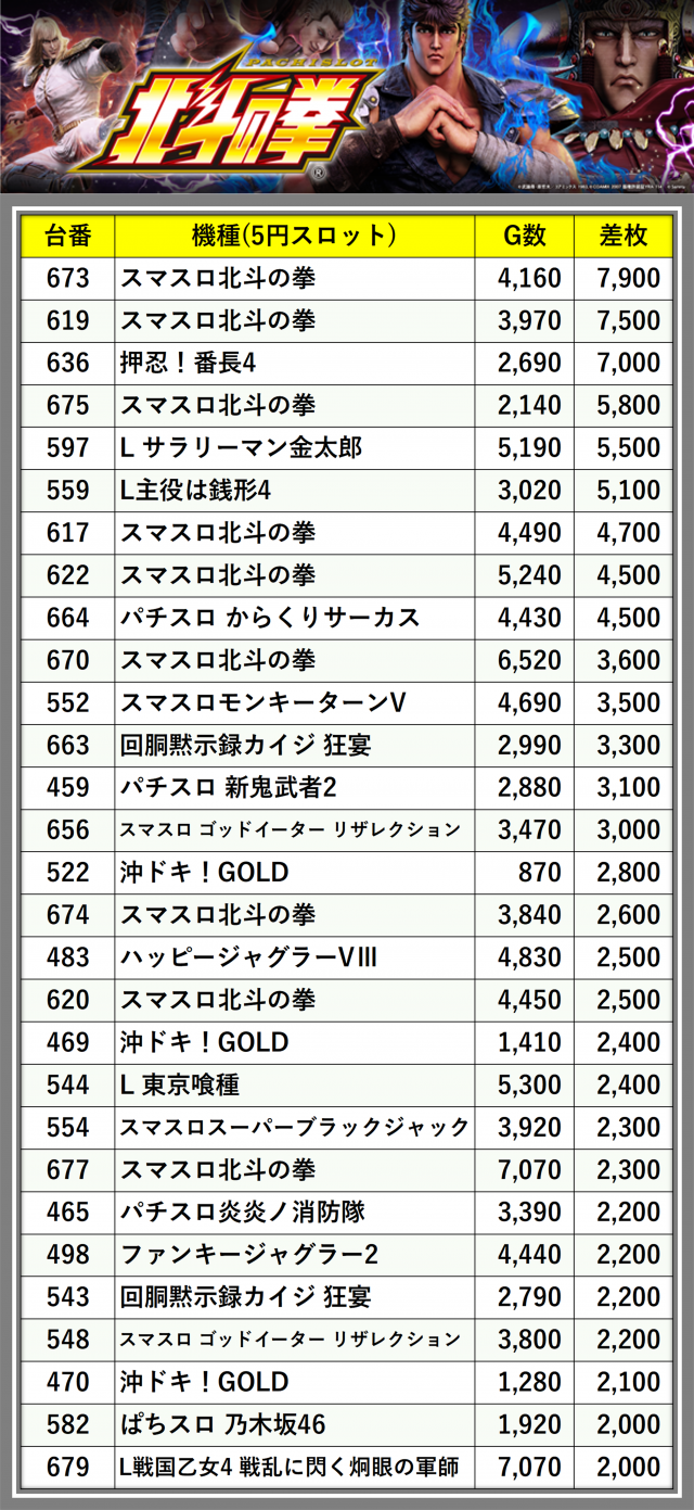 厳選された取材対象機種をはじめ、その他スロット全体から好記録が飛び出した!プレイヤーが楽しんだ1日を下記データにて振り返ってみて欲しい。