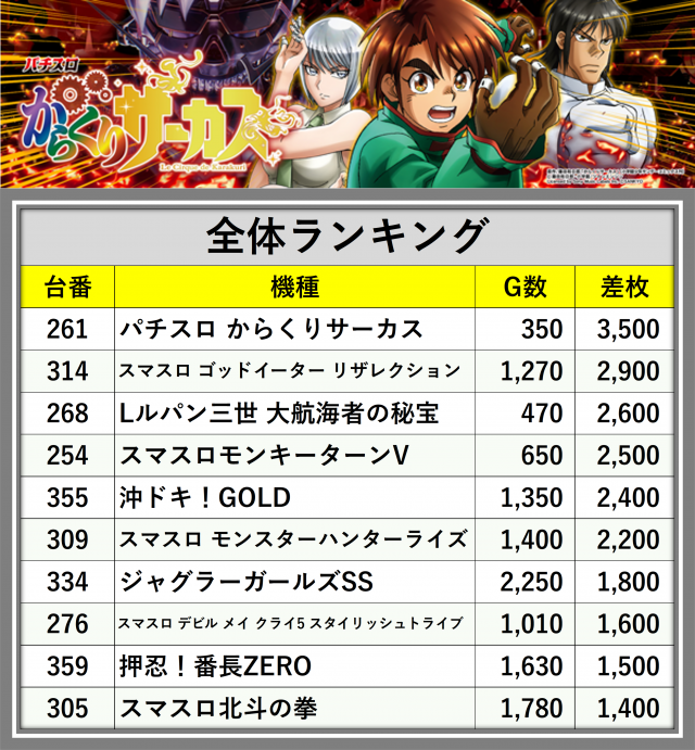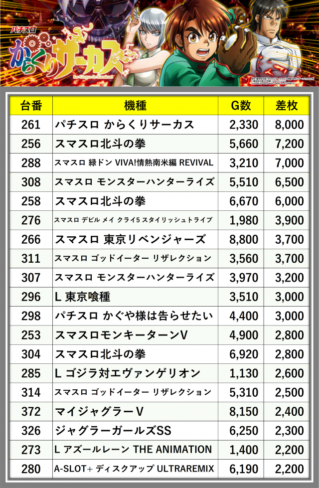 厳選された取材対象機種をはじめ、その他スロット全体から好記録が飛び出した!プレイヤーが楽しんだ1日を下記データにて振り返ってみて欲しい。
