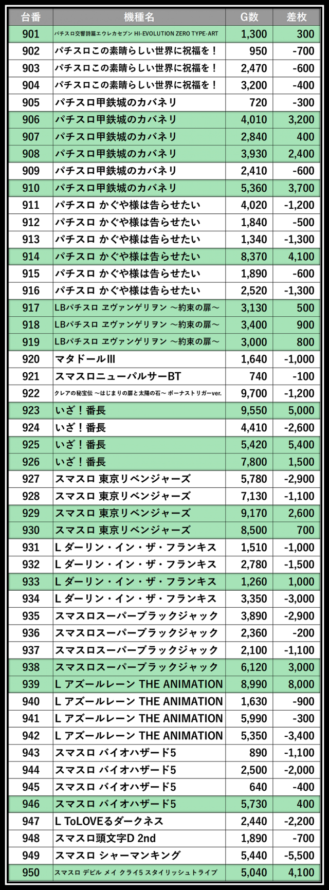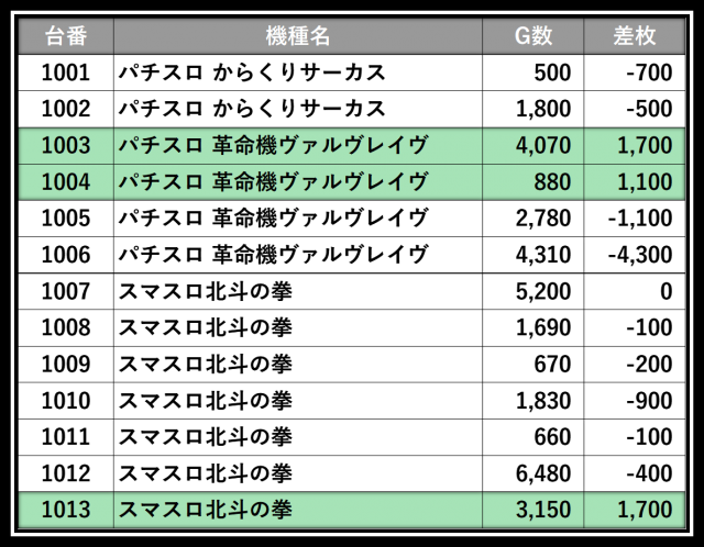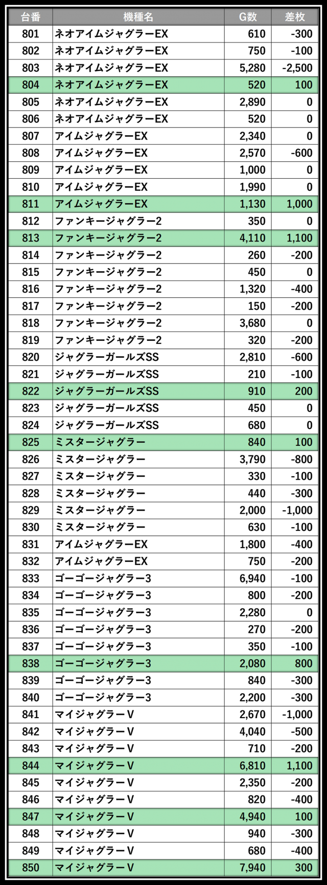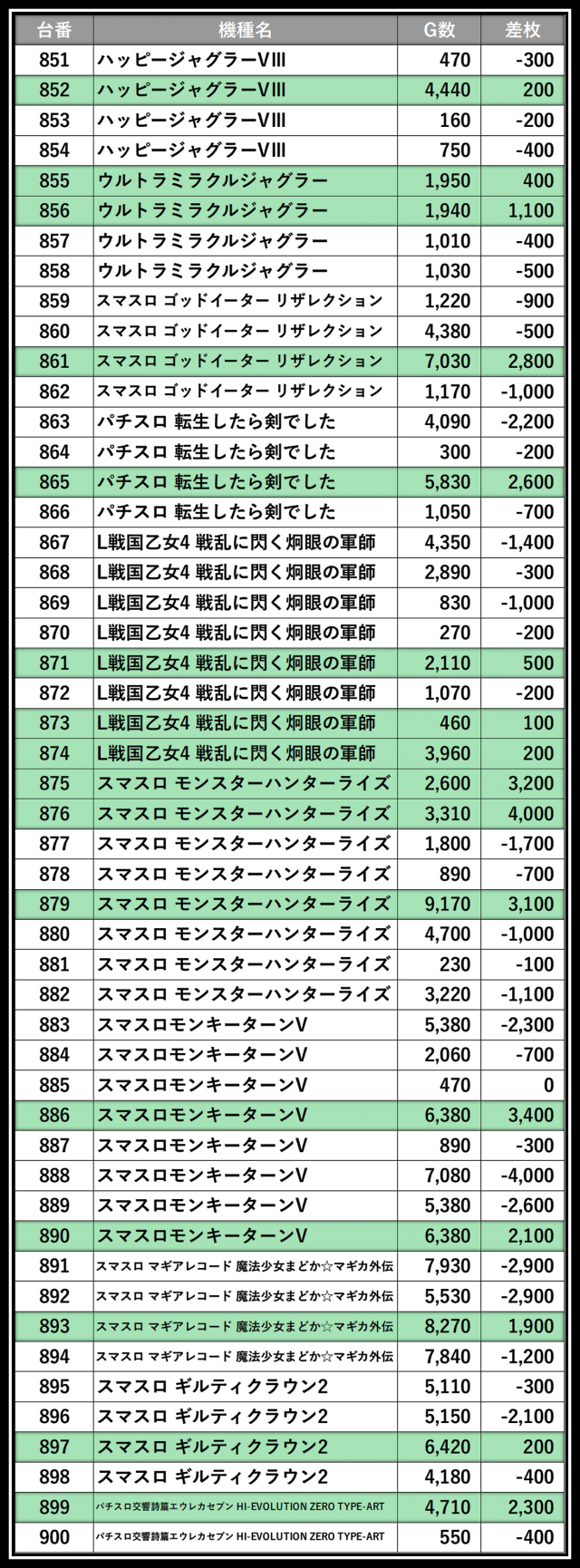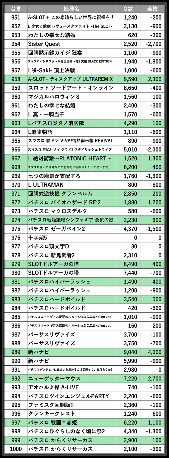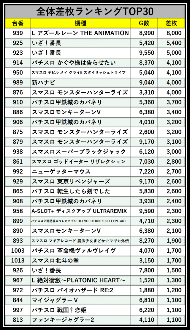 ※差枚数順に掲載しています