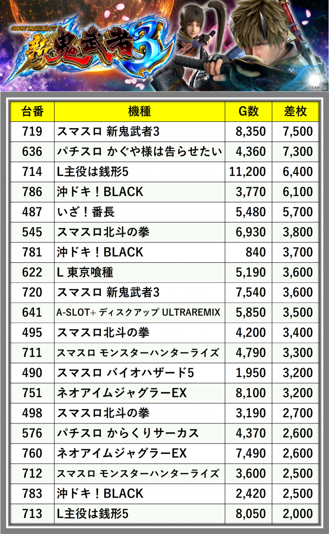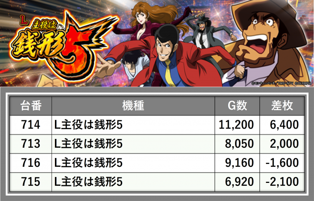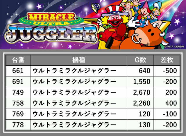 厳選された取材対象機種をはじめ、その他スロット全体から好記録が飛び出した!プレイヤーが楽しんだ1日を下記データにて振り返ってみて欲しい。